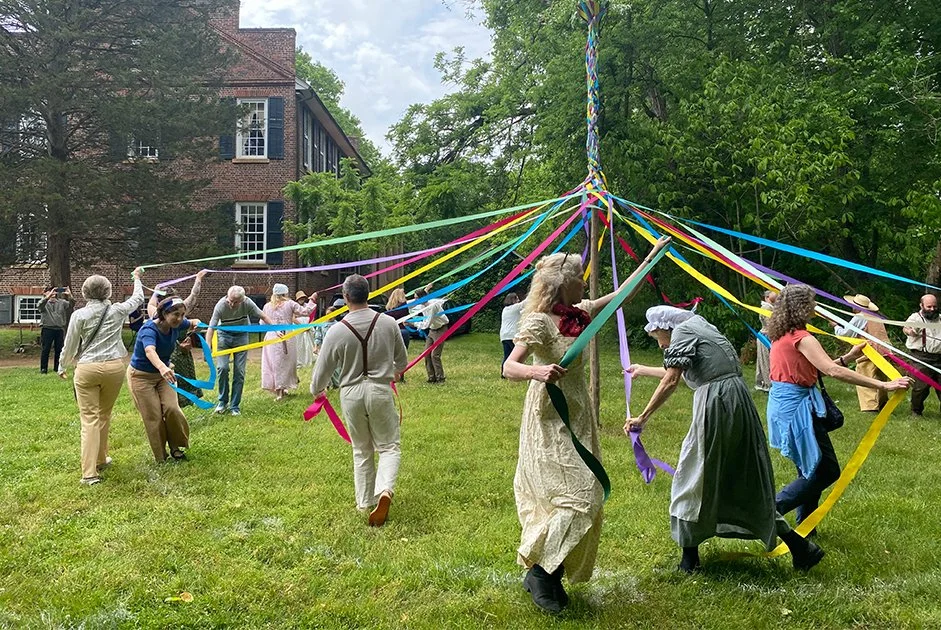 May Day 1775 : Participants take part in traditional Maypole dancing during a HEARTS Living History event, celebrating community, movement, and early American traditions at one of HEARTS’ historic sites.
