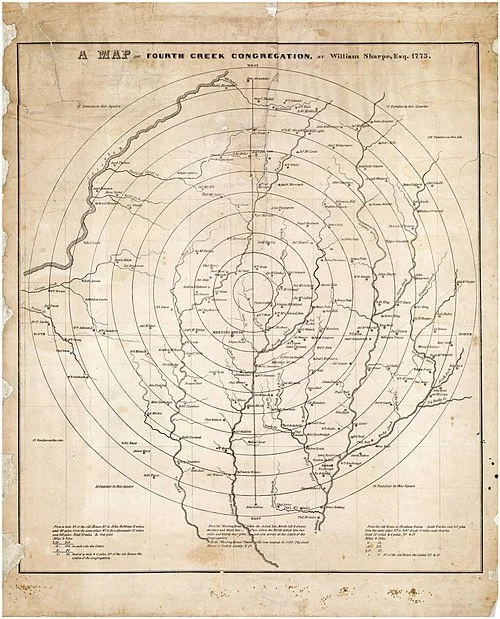 Shown here is a bullseye map of the Fourth Creek Congregation, by William Sharpe, Esq. 1773